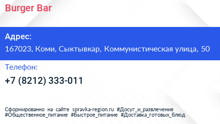 Burger Bar по адресу 167023, Коми, Сыктывкар, Коммунистическая улица, 50 в дальнейшем Организация, размещена в следующих категориях: