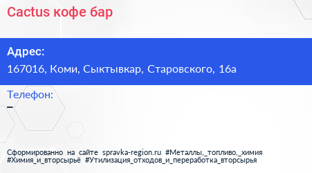 Cactus, кофе-бар по адресу 167016, Коми, Сыктывкар, Старовского, 16а в дальнейшем Организация, размещена в следующих категориях: