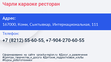 Чарли, караоке-ресторан по адресу 167000, Коми, Сыктывкар, Интернациональная, 111 в дальнейшем Организация, размещена в следующих категориях: