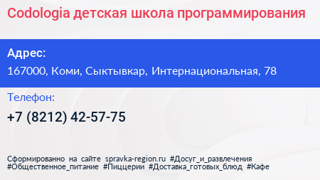 Codologia, детская школа программирования по адресу 167000, Коми, Сыктывкар, Интернациональная, 78 в дальнейшем Организация, размещена в следующих категориях: