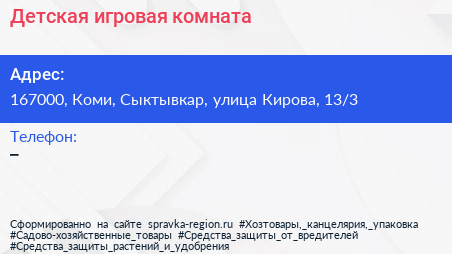 Детская игровая комната по адресу 167000, Коми, Сыктывкар, улица Кирова, 13/3 в дальнейшем Организация, размещена в следующих категориях: