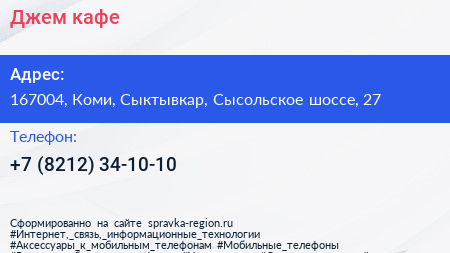 Джем, кафе по адресу 167004, Коми, Сыктывкар, Сысольское шоссе, 27 в дальнейшем Организация, размещена в следующих категориях: