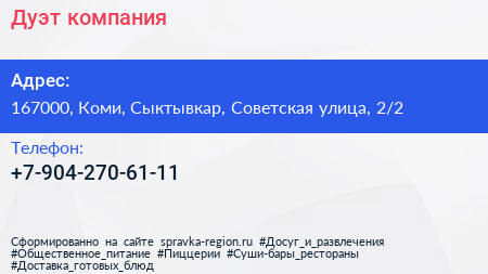 Дуэт, компания по адресу 167000, Коми, Сыктывкар, Советская улица, 2/2 в дальнейшем Организация, размещена в следующих категориях: