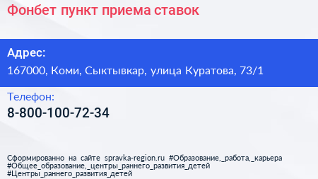 Фонбет, пункт приема ставок по адресу 167000, Коми, Сыктывкар, улица Куратова, 73/1 в дальнейшем Организация, размещена в следующих категориях: