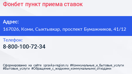 Фонбет, пункт приема ставок по адресу 167026, Коми, Сыктывкар, проспект Бумажников, 41/12 в дальнейшем Организация, размещена в следующих категориях:
