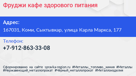 Фруджи, кафе здорового питания по адресу 167031, Коми, Сыктывкар, улица Карла Маркса, 177 в дальнейшем Организация, размещена в следующих категориях: