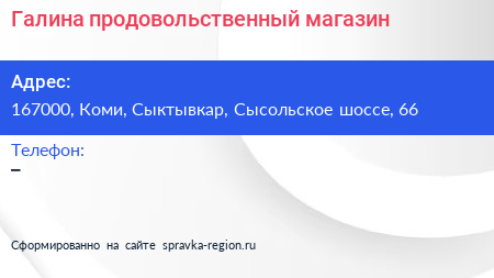 Галина, продовольственный магазин по адресу 167000, Коми, Сыктывкар, Сысольское шоссе, 66 в дальнейшем Организация, размещена в следующих категориях: