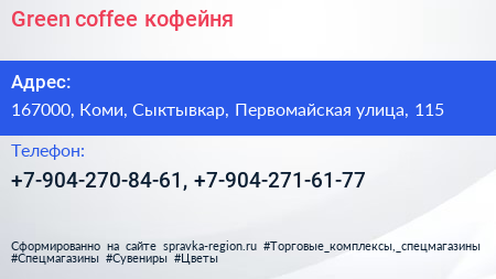 Green coffee, кофейня по адресу 167000, Коми, Сыктывкар, Первомайская улица, 115 в дальнейшем Организация, размещена в следующих категориях: