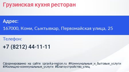 Грузинская кухня, ресторан по адресу 167000, Коми, Сыктывкар, Первомайская улица, 25 в дальнейшем Организация, размещена в следующих категориях: