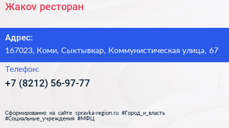 Жакоv, ресторан по адресу 167023, Коми, Сыктывкар, Коммунистическая улица, 67 в дальнейшем Организация, размещена в следующих категориях: