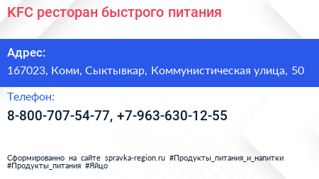 KFC, ресторан быстрого питания по адресу 167023, Коми, Сыктывкар, Коммунистическая улица, 50 в дальнейшем Организация, размещена в следующих категориях: