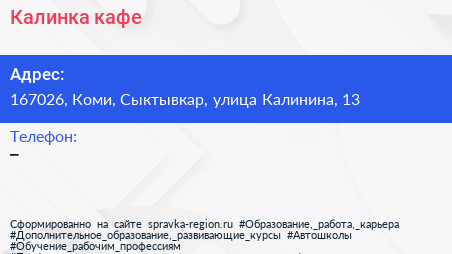 Калинка, кафе по адресу 167026, Коми, Сыктывкар, улица Калинина, 13 в дальнейшем Организация, размещена в следующих категориях: