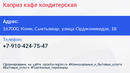 Каприз, кафе-кондитерская по адресу 167000, Коми, Сыктывкар, улица Орджоникидзе, 18 в дальнейшем Организация, размещена в следующих категориях: