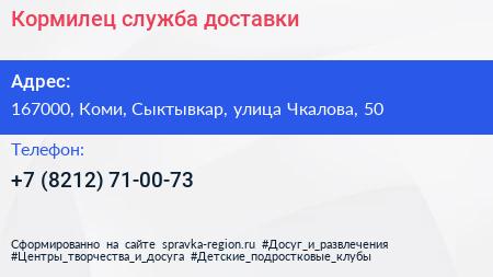 Кормилец, служба доставки по адресу 167000, Коми, Сыктывкар, улица Чкалова, 50 в дальнейшем Организация, размещена в следующих категориях: