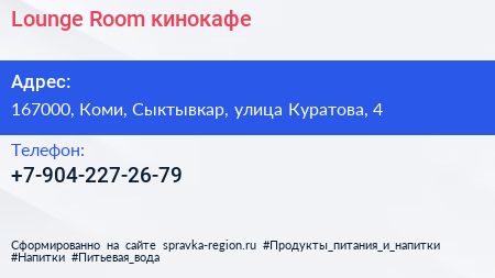 Lounge Room, кинокафе по адресу 167000, Коми, Сыктывкар, улица Куратова, 4 в дальнейшем Организация, размещена в следующих категориях: