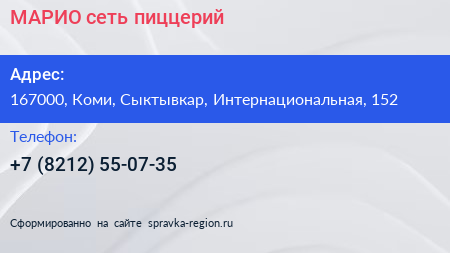 МАРИО, сеть пиццерий по адресу 167000, Коми, Сыктывкар, Интернациональная, 152 в дальнейшем Организация, размещена в следующих категориях: