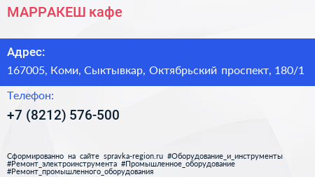 МАРРАКЕШ, кафе по адресу 167005, Коми, Сыктывкар, Октябрьский проспект, 180/1 в дальнейшем Организация, размещена в следующих категориях: