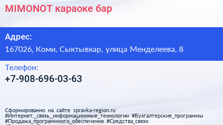 MIMONOT, караоке-бар по адресу 167026, Коми, Сыктывкар, улица Менделеева, 8 в дальнейшем Организация, размещена в следующих категориях: