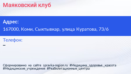 Маяковский, клуб по адресу 167000, Коми, Сыктывкар, улица Куратова, 73/6 в дальнейшем Организация, размещена в следующих категориях: