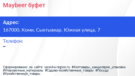 Maybeer, буфет по адресу 167000, Коми, Сыктывкар, Южная улица, 7 в дальнейшем Организация, размещена в следующих категориях: