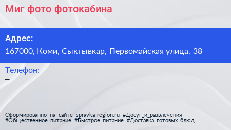 Миг фото, фотокабина по адресу 167000, Коми, Сыктывкар, Первомайская улица, 38 в дальнейшем Организация, размещена в следующих категориях: