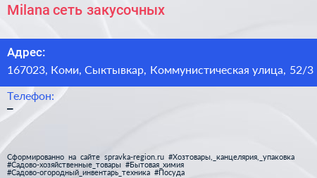 Milana, сеть закусочных по адресу 167023, Коми, Сыктывкар, Коммунистическая улица, 52/3 в дальнейшем Организация, размещена в следующих категориях: