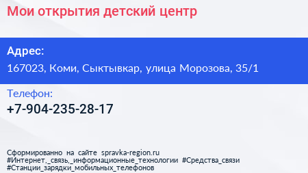 Мои открытия, детский центр по адресу 167023, Коми, Сыктывкар, улица Морозова, 35/1 в дальнейшем Организация, размещена в следующих категориях: