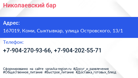 Николаевский, бар по адресу 167019, Коми, Сыктывкар, улица Островского, 13/1 в дальнейшем Организация, размещена в следующих категориях: