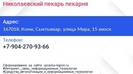 Николаевский пекарь, пекарня по адресу 167018, Коми, Сыктывкар, улица Мира, 15 киоск в дальнейшем Организация, размещена в следующих категориях: