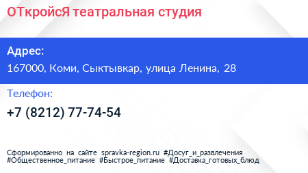 ОТкройсЯ, театральная студия по адресу 167000, Коми, Сыктывкар, улица Ленина, 28 в дальнейшем Организация, размещена в следующих категориях: