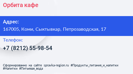 Орбита, кафе по адресу 167005, Коми, Сыктывкар, Петрозаводская, 17 в дальнейшем Организация, размещена в следующих категориях:
