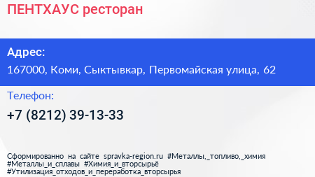 ПЕНТХАУС, ресторан по адресу 167000, Коми, Сыктывкар, Первомайская улица, 62 в дальнейшем Организация, размещена в следующих категориях: