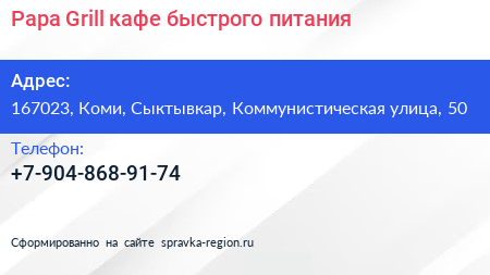 Papa Grill, кафе быстрого питания по адресу 167023, Коми, Сыктывкар, Коммунистическая улица, 50 в дальнейшем Организация, размещена в следующих категориях:
