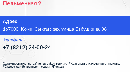 Пельменная-№2 по адресу 167000, Коми, Сыктывкар, улица Бабушкина, 38 в дальнейшем Организация, размещена в следующих категориях: