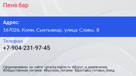 Пена, бар по адресу 167026, Коми, Сыктывкар, улица Славы, 8 в дальнейшем Организация, размещена в следующих категориях: