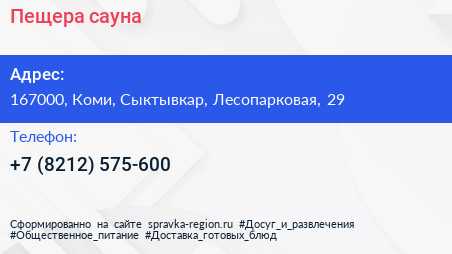 Пещера, сауна по адресу 167000, Коми, Сыктывкар, Лесопарковая, 29 в дальнейшем Организация, размещена в следующих категориях: