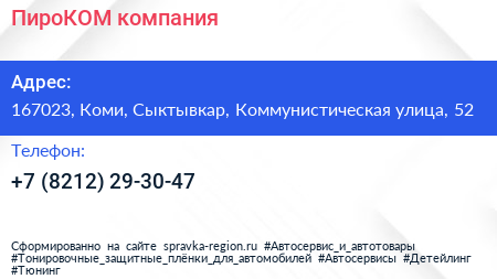ПироКОМ, компания по адресу 167023, Коми, Сыктывкар, Коммунистическая улица, 52 в дальнейшем Организация, размещена в следующих категориях: