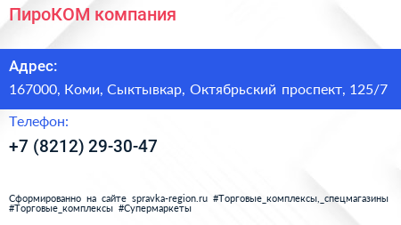 ПироКОМ, компания по адресу 167000, Коми, Сыктывкар, Октябрьский проспект, 125/7 в дальнейшем Организация, размещена в следующих категориях: