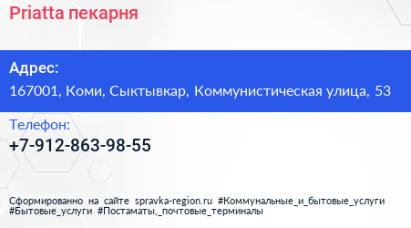 Priatta, пекарня по адресу 167001, Коми, Сыктывкар, Коммунистическая улица, 53 в дальнейшем Организация, размещена в следующих категориях: