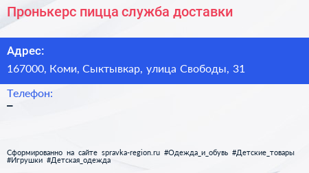 Пронькерс пицца, служба доставки по адресу 167000, Коми, Сыктывкар, улица Свободы, 31 в дальнейшем Организация, размещена в следующих категориях: