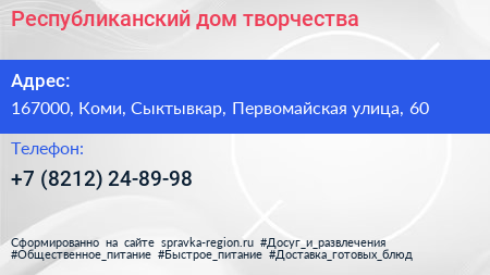 Республиканский дом творчества по адресу 167000, Коми, Сыктывкар, Первомайская улица, 60 в дальнейшем Организация, размещена в следующих категориях: