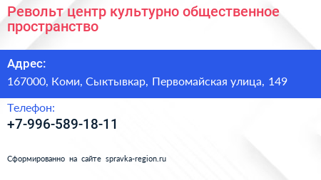 Револьт-центр, культурно-общественное пространство по адресу 167000, Коми, Сыктывкар, Первомайская улица, 149 в дальнейшем Организация, размещена в следующих категориях: