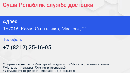 Суши Репаблик, служба доставки по адресу 167016, Коми, Сыктывкар, Маегова, 21 в дальнейшем Организация, размещена в следующих категориях: