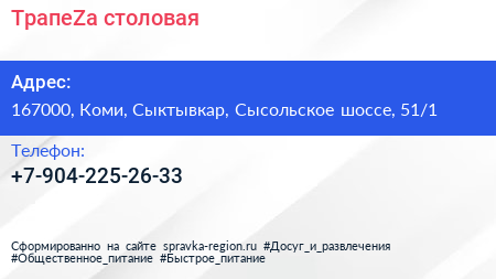 ТрапеZа, столовая по адресу 167000, Коми, Сыктывкар, Сысольское шоссе, 51/1 в дальнейшем Организация, размещена в следующих категориях: