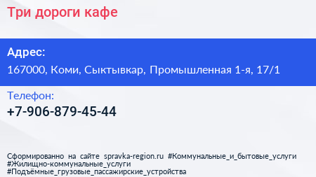 Три дороги, кафе по адресу 167000, Коми, Сыктывкар, Промышленная 1-я, 17/1 в дальнейшем Организация, размещена в следующих категориях: