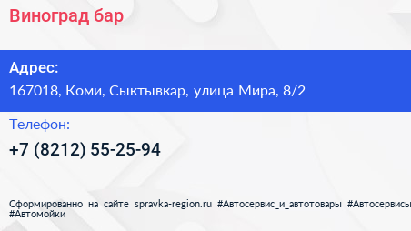 Виноград, бар по адресу 167018, Коми, Сыктывкар, улица Мира, 8/2 в дальнейшем Организация, размещена в следующих категориях: