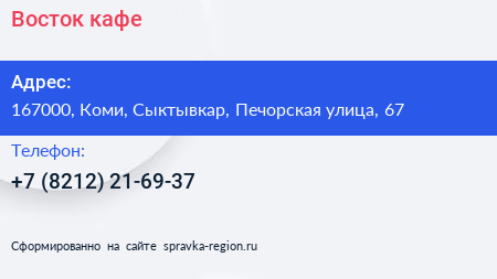 Восток, кафе по адресу 167000, Коми, Сыктывкар, Печорская улица, 67 в дальнейшем Организация, размещена в следующих категориях: