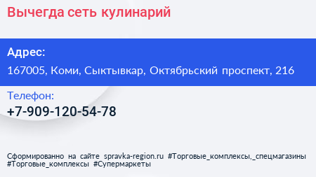 Вычегда, сеть кулинарий по адресу 167005, Коми, Сыктывкар, Октябрьский проспект, 216 в дальнейшем Организация, размещена в следующих категориях: