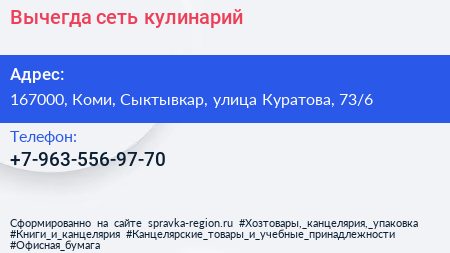 Вычегда, сеть кулинарий по адресу 167000, Коми, Сыктывкар, улица Куратова, 73/6 в дальнейшем Организация, размещена в следующих категориях: