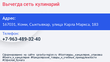 Вычегда, сеть кулинарий по адресу 167031, Коми, Сыктывкар, улица Карла Маркса, 183 в дальнейшем Организация, размещена в следующих категориях: